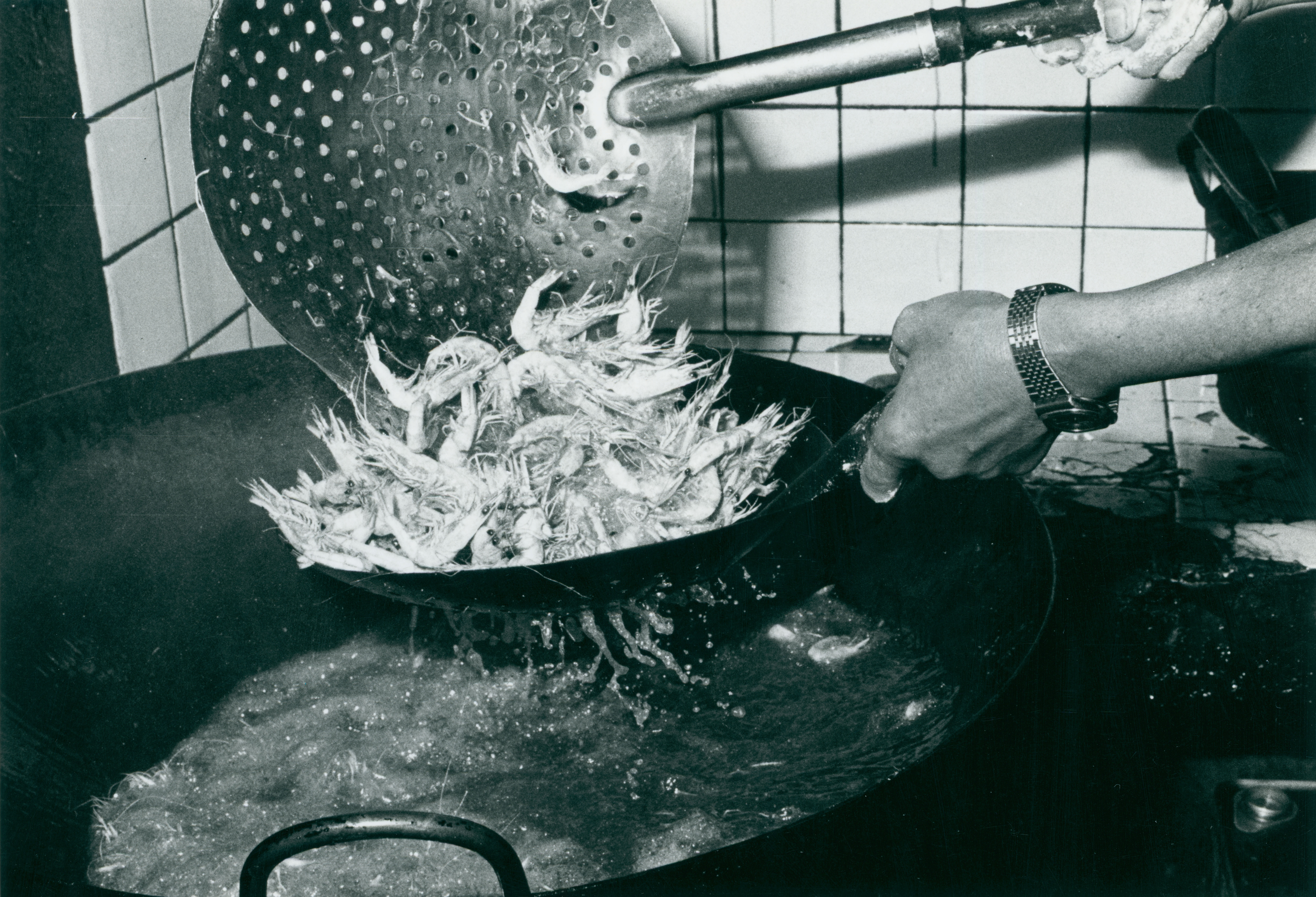 左圖:包飯中心的飯菜都是買回材料自己烹製,圖為在油鍋內炸蝦。(張良綱)