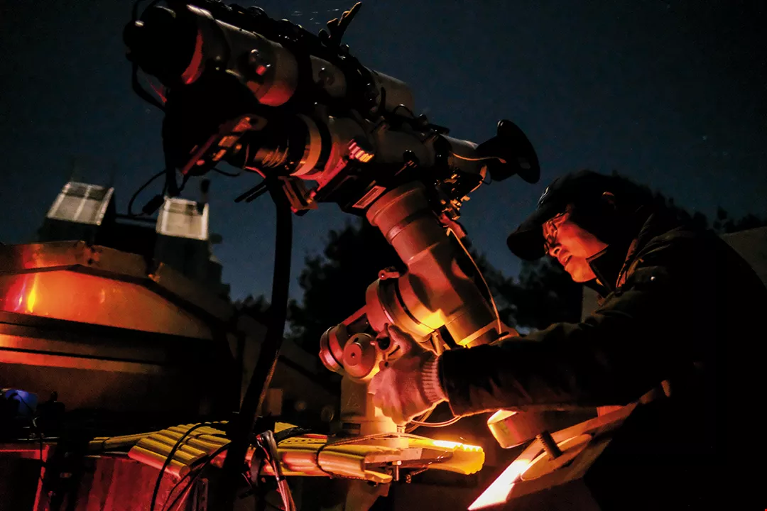 林宏欽熟練地操作望遠鏡,這是他30年前背負上山、陪他度過無數寒夜的夥伴。