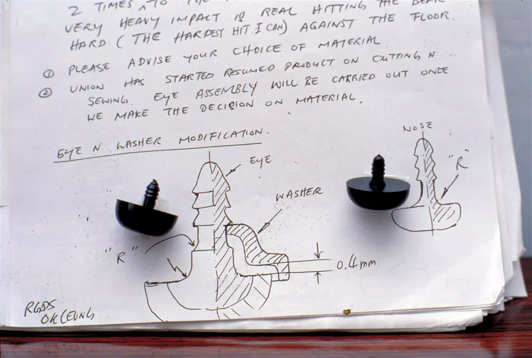 上)友利公司修改Tyco熊眼睛的草圖,左為原來的眼睛,右為新眼睛,在螺絲桿和眼睛間有了弧度。(張良綱)