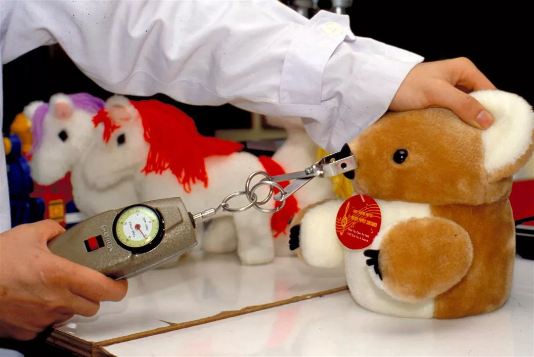 因應小孩喜歡把東西往嘴裏塞的「毛病」,玩具的各種小配件,也必須做拉力測試。檢驗人員用夾子夾住玩具熊的鼻子,再用可顯示拉力大小的計重表勾住夾子、施加拉力,看看小熊的鼻子會不會脫落。
