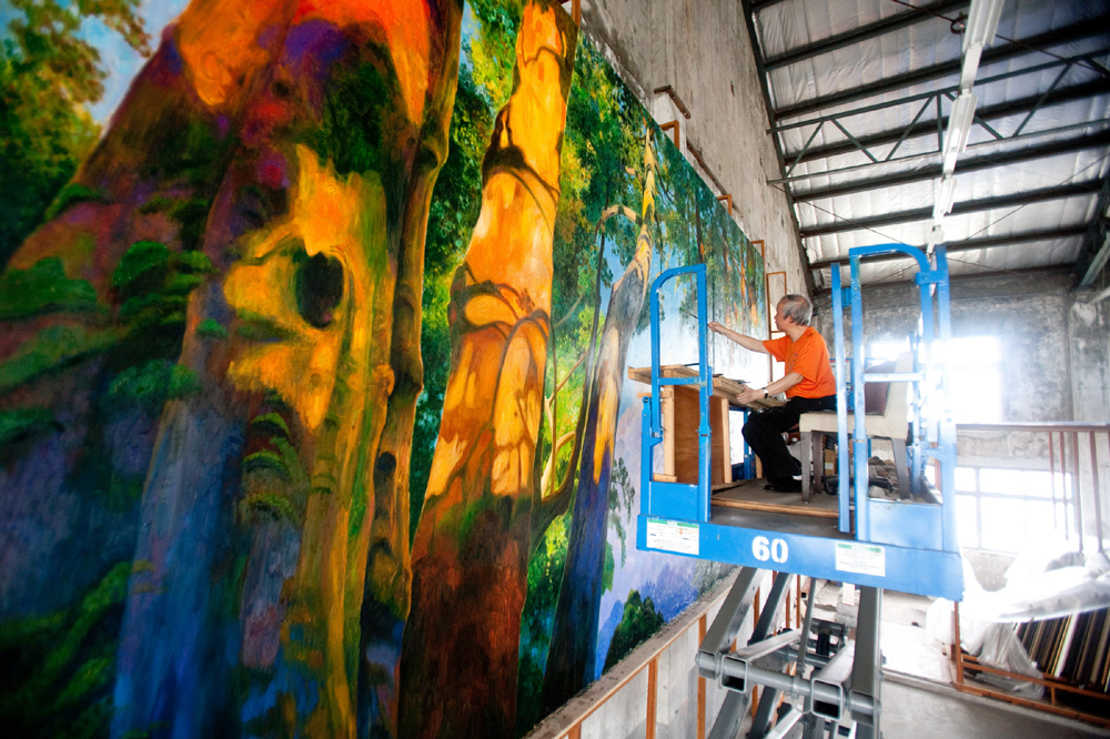 任何形式的創作,是表達,也是療癒。圖為74歲的資深畫家林惺嶽,在得知自己患有帕金森氏症後,仍挑戰自我,創作「台灣神木的風雲歲月」一景。