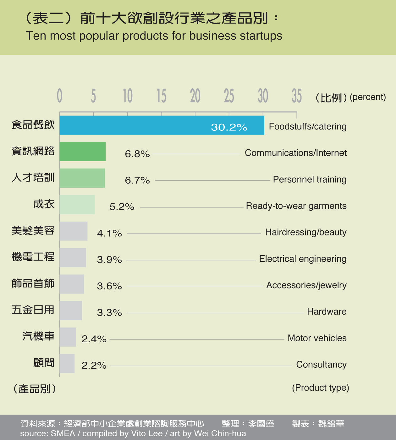 (表一)以食品餐飲業為主的服務業仍是創業者最愛資料來源:經濟部中小企業處創業諮詢服務中心