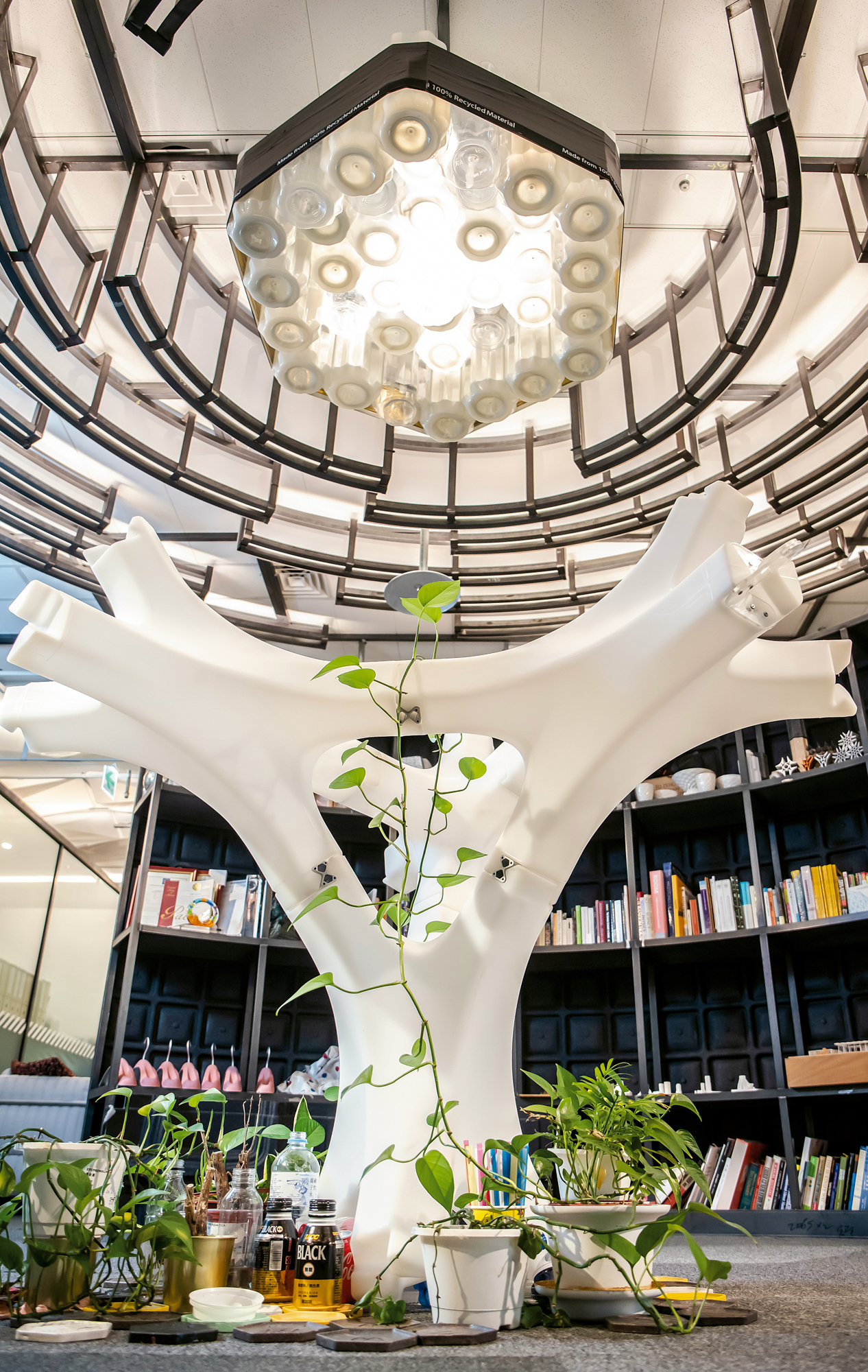 小智研發辦公室裡陳列的物品不僅全都是回收廢料循環再製,也代表著創業至今的歷程。(林旻萱攝)