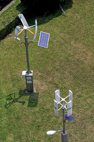 步入清華大學,在右邊路旁就能看到第一座仰賴風力和太陽能發電的「風光綠能」路燈,燈桿頂端三、四片隨風轉動的葉片,加上一小面太陽能板、一盞LED燈,就大功告成。因體積不若大型風力發電機般龐大顯著,經過時也沒有風車轉動的呼嘯聲,很容易讓人忽視它的存在。