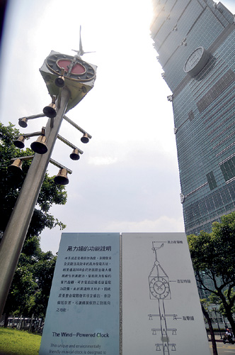 風力的用途廣泛,台北101大樓旁的風力鐘上方不停旋轉的小風扇正是動力來源。