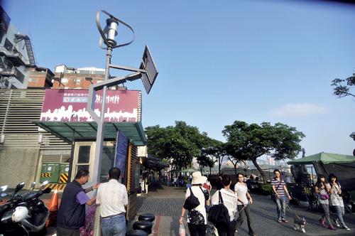有風「吃」風,沒風「吃」太陽,風光互補路燈一天可以存下三、四天的電力。圖為台北市新光華商場外的綠能路燈。