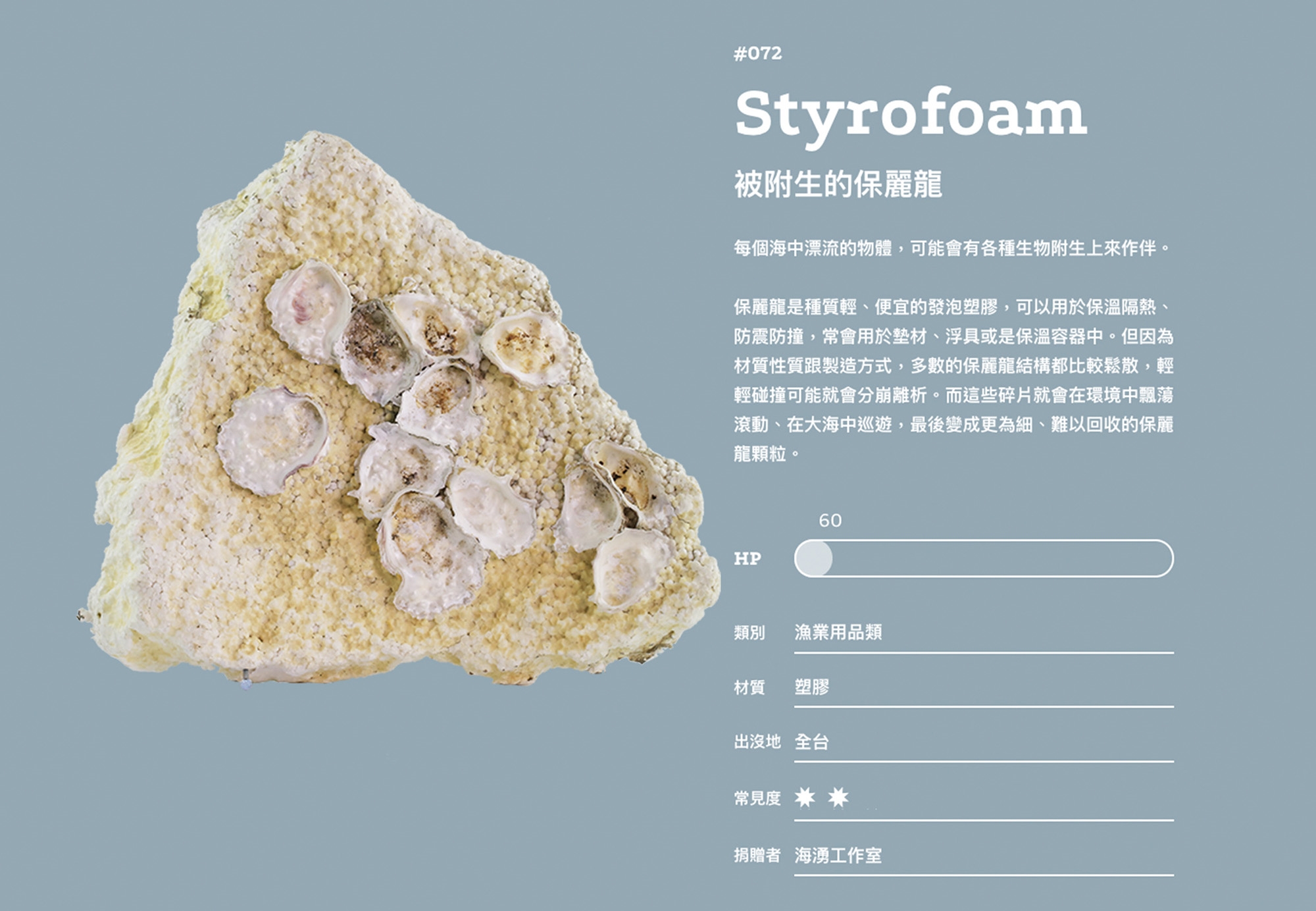 《海廢圖鑑》結合寶可夢的遊戲概念,為海廢標上出沒地點和HP生命值,淺顯易懂的傳達海廢議題。(RE-THINK重新思考提供)