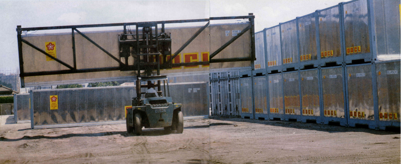 佔地二千多坪的貨櫃工廠,裡面傳出陣陣震耳欲聾之聲,這是上卯釘的聲音。由擠型工廠完成的鋁板、鋁條等送過來之後,先由銲工把這些材料焊接起來,然後打進卯釘,裝上底層的地板,接著噴漆,上商標,就完成了一個個大貨櫃。