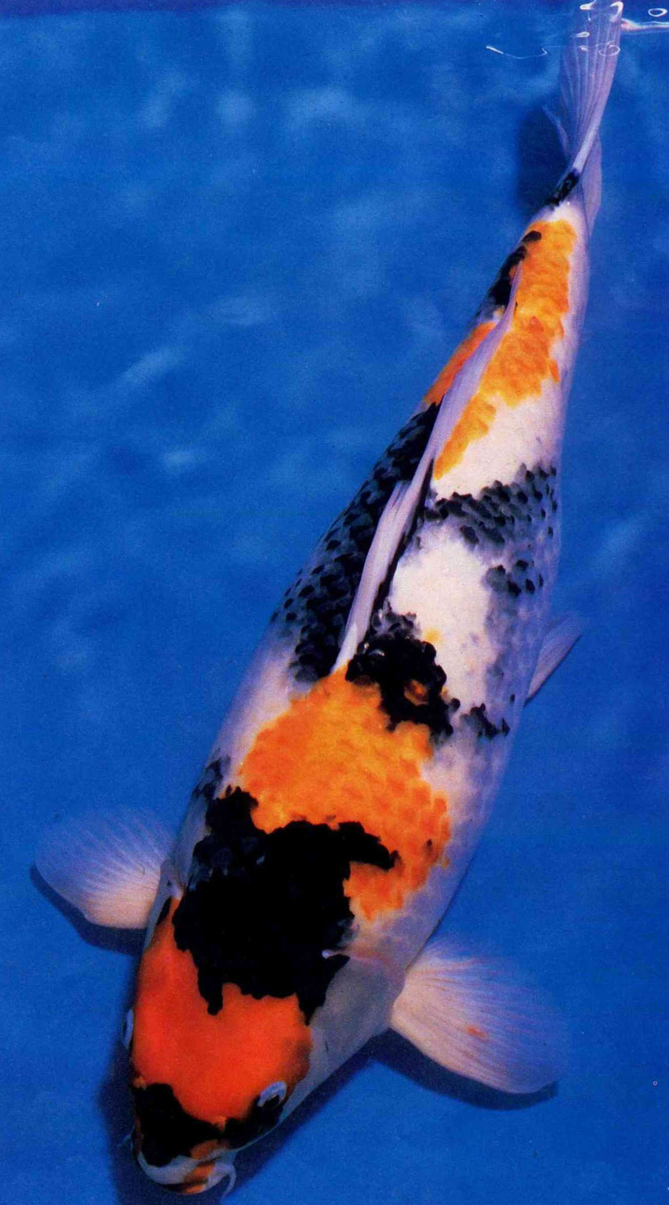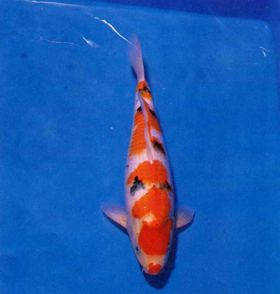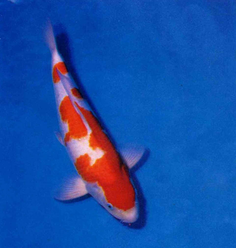 再說斑紋,重點在頭部與背部之間,頭頂須有大紅斑,紅白繫在頸部宜有白底缺口,各品種尾部均以留白為佳,如此魚尾看來較輕,才不致有「尾大不掉」的感覺。