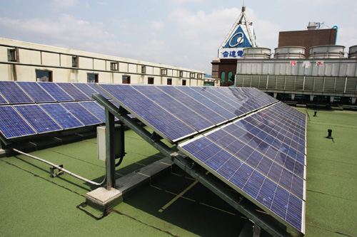 服膺「綠色競爭力」的台達電,把環保理念和經營策略結合,發展節能技術和產品,不但帶來商機,也贏得好名聲。圖為台達電內湖總部頂樓設置的太陽能板。