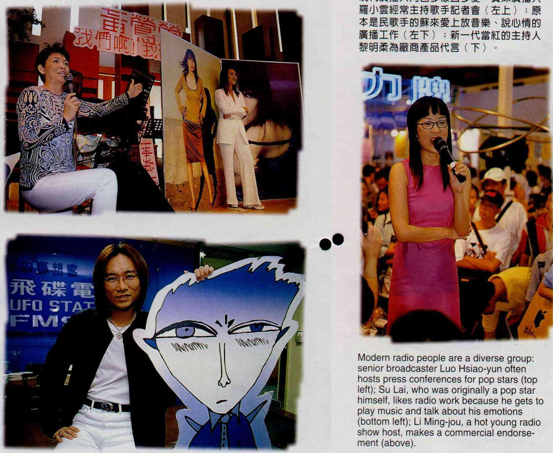 現代廣播人角色多樣且多變:資深廣播人羅小雲經常主持歌手記者會(左上);原本是民歌手的蘇來愛上放音樂、說心情的廣播工作(左下);新一代當紅的主持人黎明柔為廠商產品代言(下)。