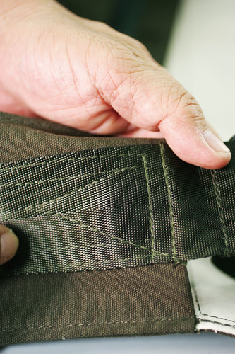 因此他將最易因載重而脫線斷裂的帆布背帶,改為與降落傘安全帶同級的尼龍帶;銜接背帶的扣環,也從較軟的銅環,換成堅硬不變形的塑鋼材質,即使長期承重上百公斤也不會損壞。「光是一條帶子成本就要幾十元!」