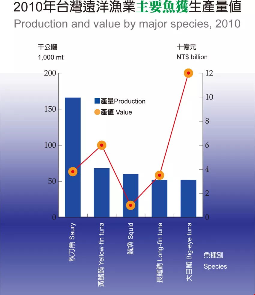 2010年台灣遠洋漁業主要魚獲生產量值/資料來源:漁業署