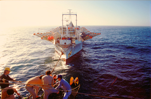 鮪延繩釣,即是在數十公里長的主繩上,綁上浮筒及數千條支繩與魚鉤後,下鉤至海裡數百公尺處釣鮪魚。