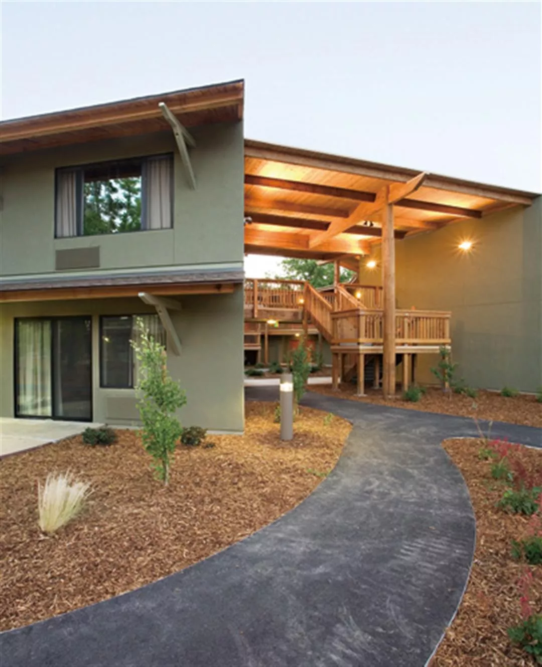 飯店設計:位於候鳥遷移路上的安德森飯店不但開挖一英畝多的天鵝湖,收集回收雨水,給千里飛翔的鳥兒一方喝水歇息空間,還因為一棵稀有樹種和棲息樹上的烏龜蟲變更設計,減少23個停車位並更改車道。