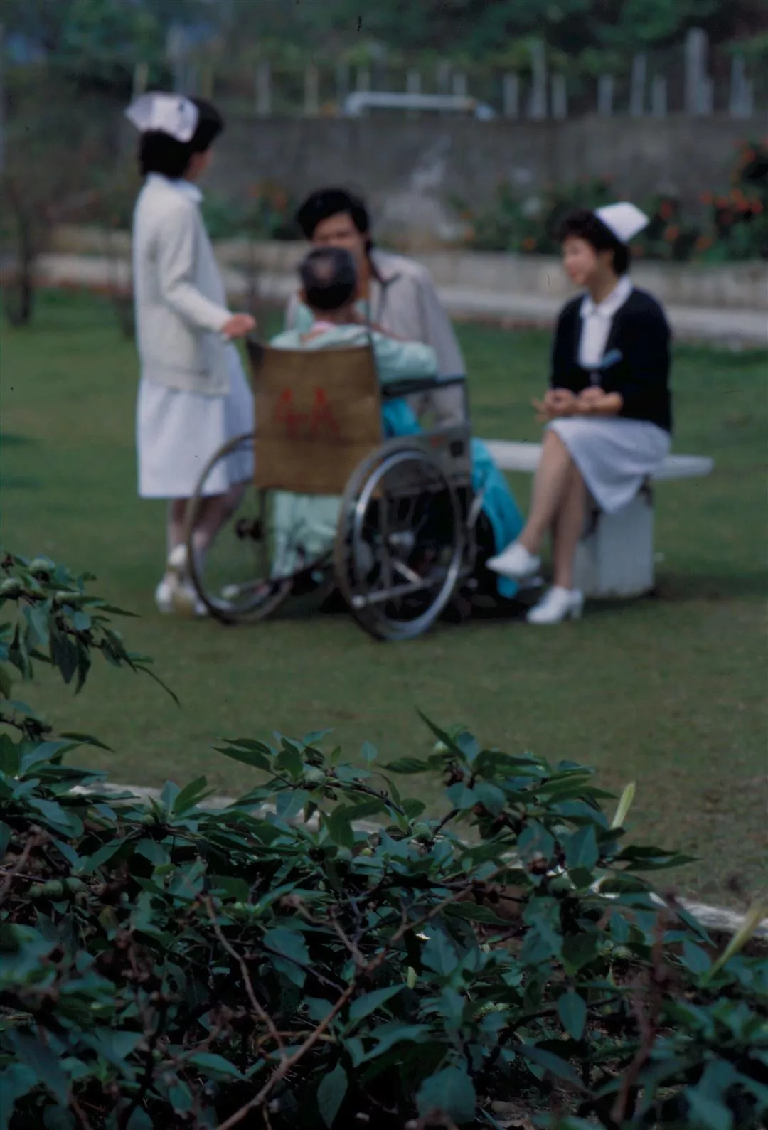 馬偕醫院的護士都受過嚴格的養成教育,對病患尤其有愛心及耐心,常陪著病患在草地上散步、聊天。(曉陽/李影/馬偕醫院提供)
