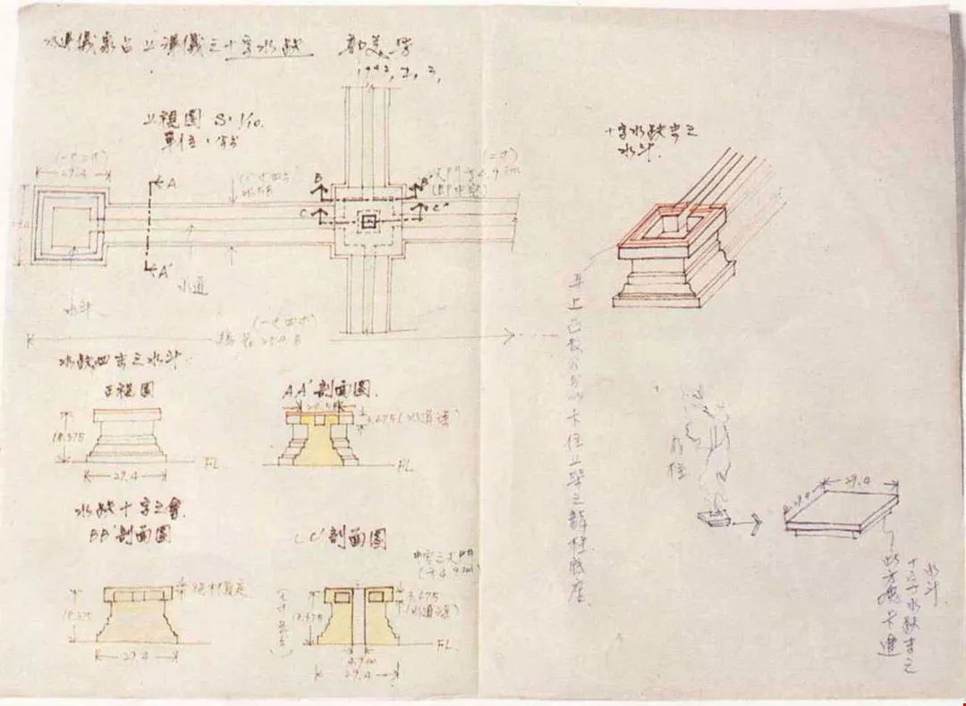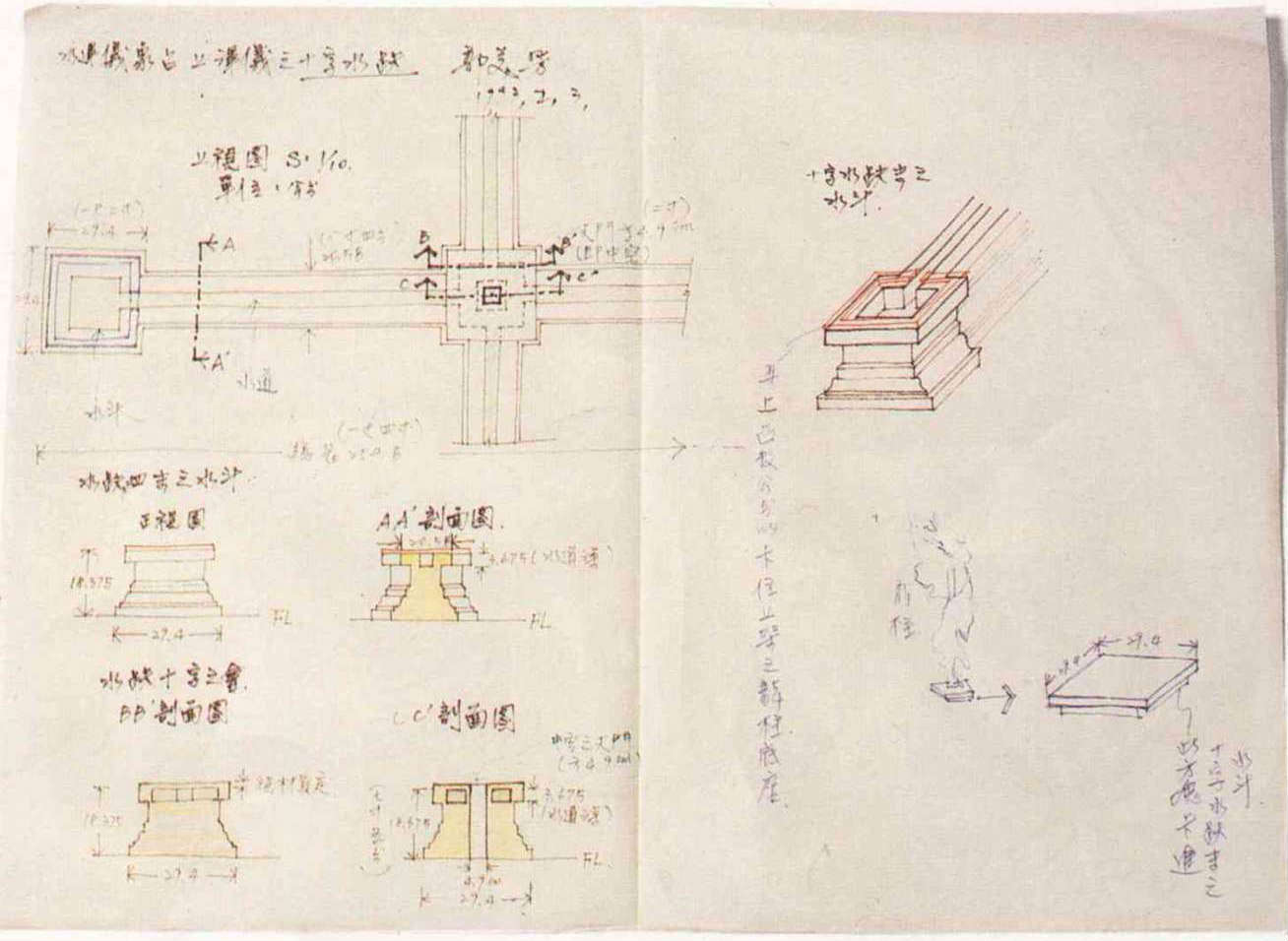 研究《新儀象法要》中平面簡圖的立體構造、構件間如何搭組,再畫出尺寸完整的草圖,是郭美芳在設計階段的重點工作。(郭美芳手稿)