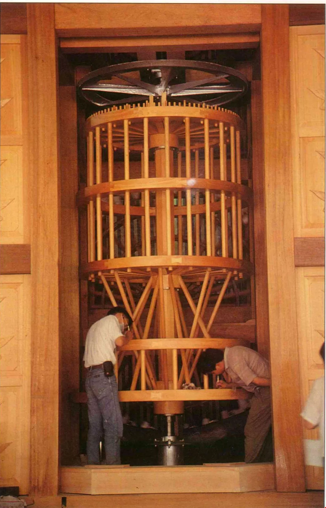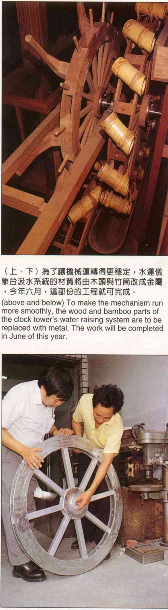 (上、下)為了讓機械運轉得更穩定,水運儀象台汲水系統的材質將由木頭與竹筒改成金屬,今年六月,這部份的工程就可完成。(薛繼光)