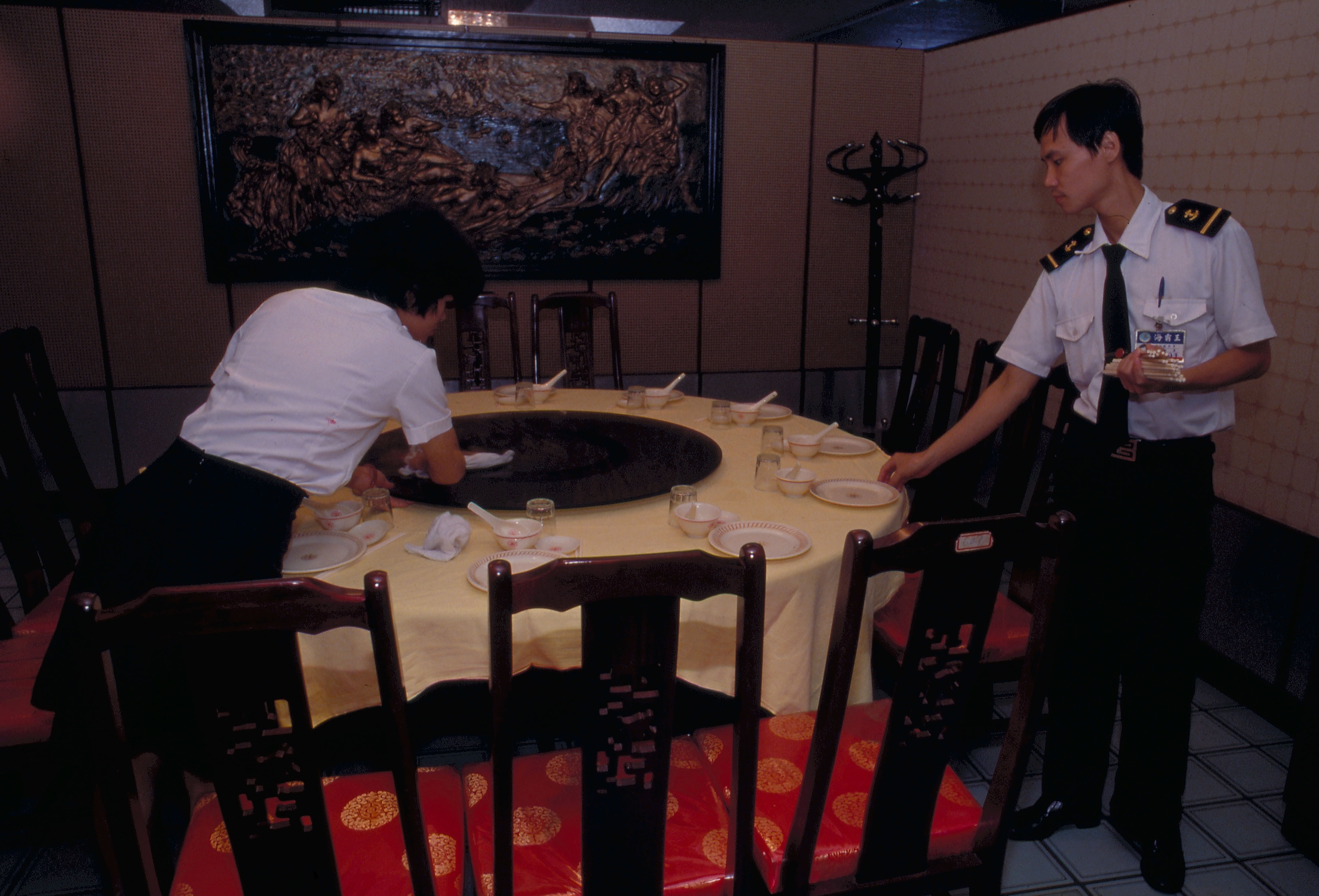 圖7:服務人員在擺設碗碟。(鐘永和)