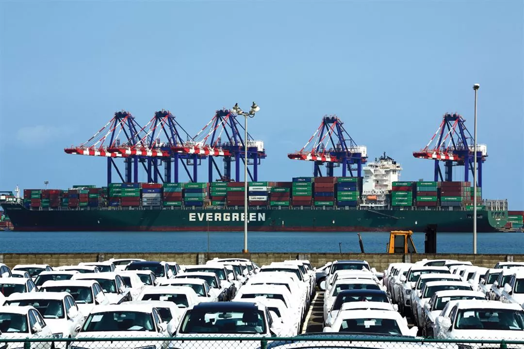 位於淡水河出口南岸的台北自由貿易港區,碼頭壯觀地停放著數百輛白色汽車,正準備運往「後廠」加工,再經由船運外銷到千里外的中東地區。