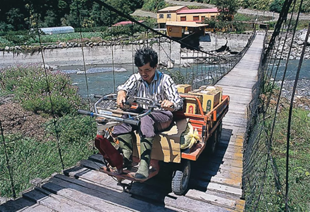 梨山地區和平農場農民黃俊雄,鑑於WTO衝擊,轉型有機種植,以小面積土地獲取較高收益,並兼營民宿。圖中他正要將幾箱蔬菜送交「宅急便」載運下山。