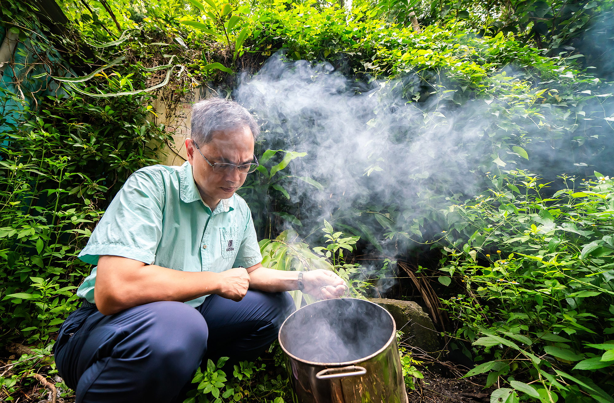 酢液是什麼?工業技術研究院中分院生質材料技術部經理黃盈賓長年投入酢液的相關研究。他將路邊野地採集到的小花蔓澤蘭,丟入一只簡易炭化爐中,隨著有機物質升溫熱裂解,煙霧裊裊而昇,他解釋,這就是酢液形成的基本程序。