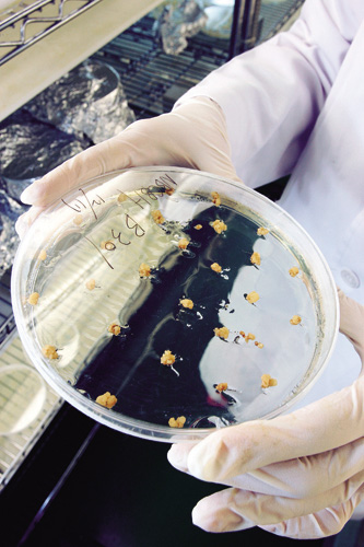 經過基因轉殖的穀粒組織,在培養皿中培養一段時日後,就能長成一株株水稻幼苗。