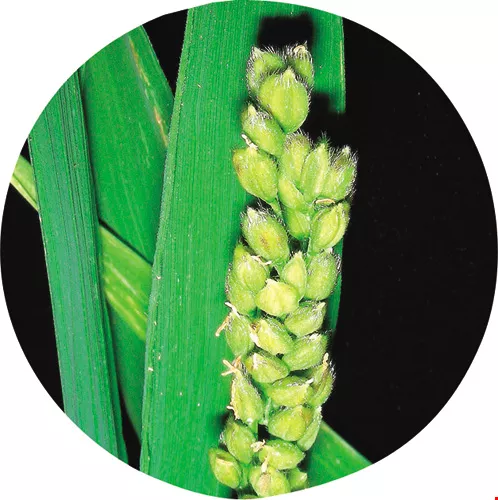 突變性狀,包括葉面變寬、棒狀稻穗及渾圓的穀粒。