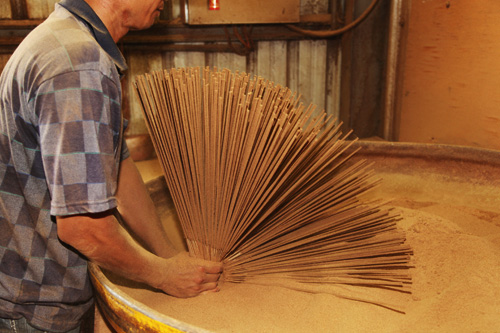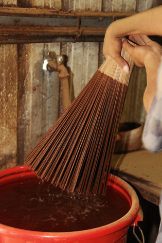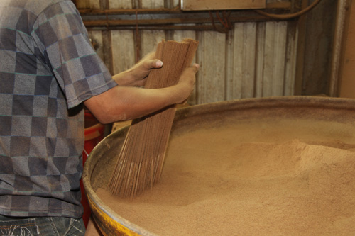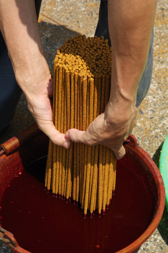 製香從香腳(手持的部分)開始,將竹片切削到寬度只有0.3公分的細條,浸油上粉後再曬乾,要將一大把竹條黏上香粉後還能保持條理分明,不會整把糊在一起,就要看手上的功夫了。
