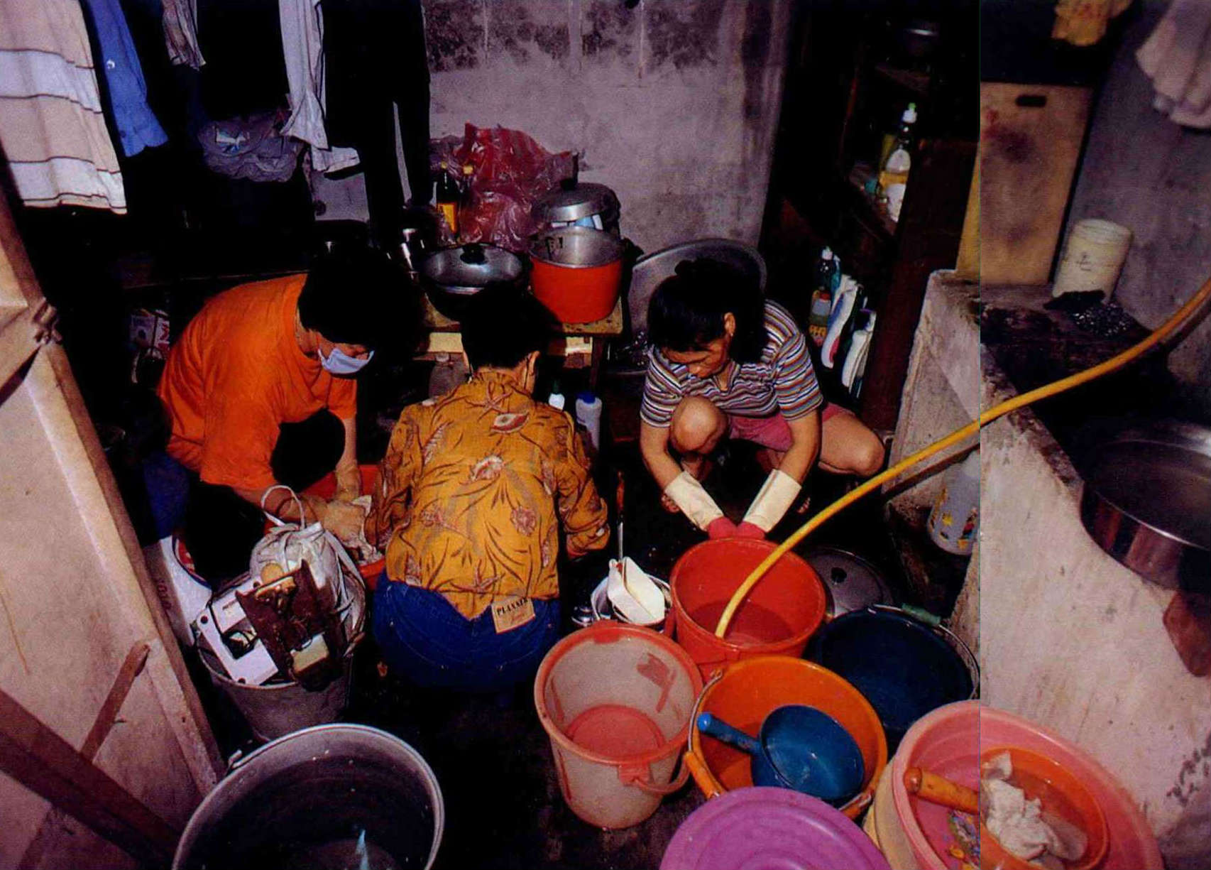 扶持弱勢需要付出極大心力,不可能光靠發錢來解決,「人」才是最重要的。圖為南投縣慈慧善行協會會員們為「老余」洗刷廚房。右圖矗立門邊者為今年七十多歲的榮民余老先生。