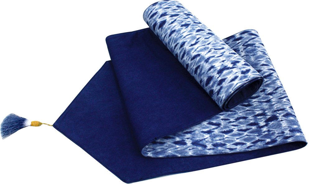 水源地文教基金會輔導身心障礙者與弱勢婦女,發揮設計的元素,把藍染工藝融入生活器具,圖為藍染桌旗。