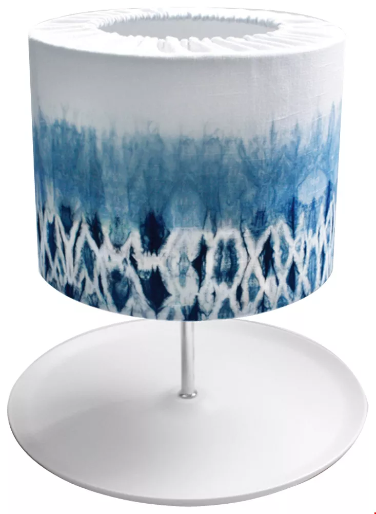 水源地文教基金會輔導身心障礙者與弱勢婦女,發揮設計的元素,把藍染工藝融入生活器具,圖為藍染桌燈。