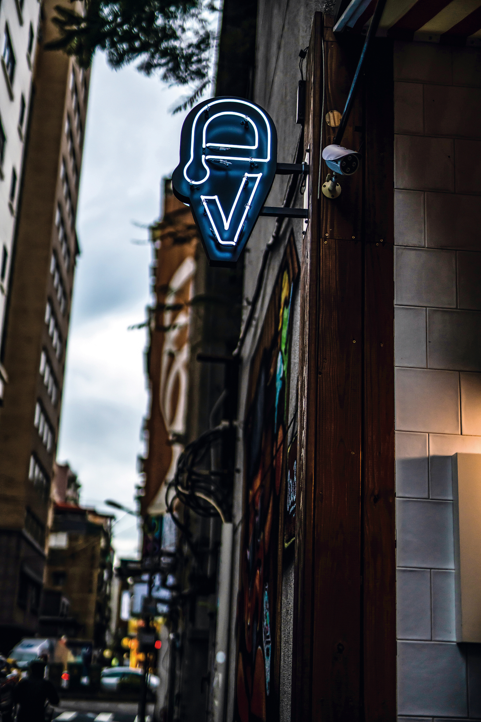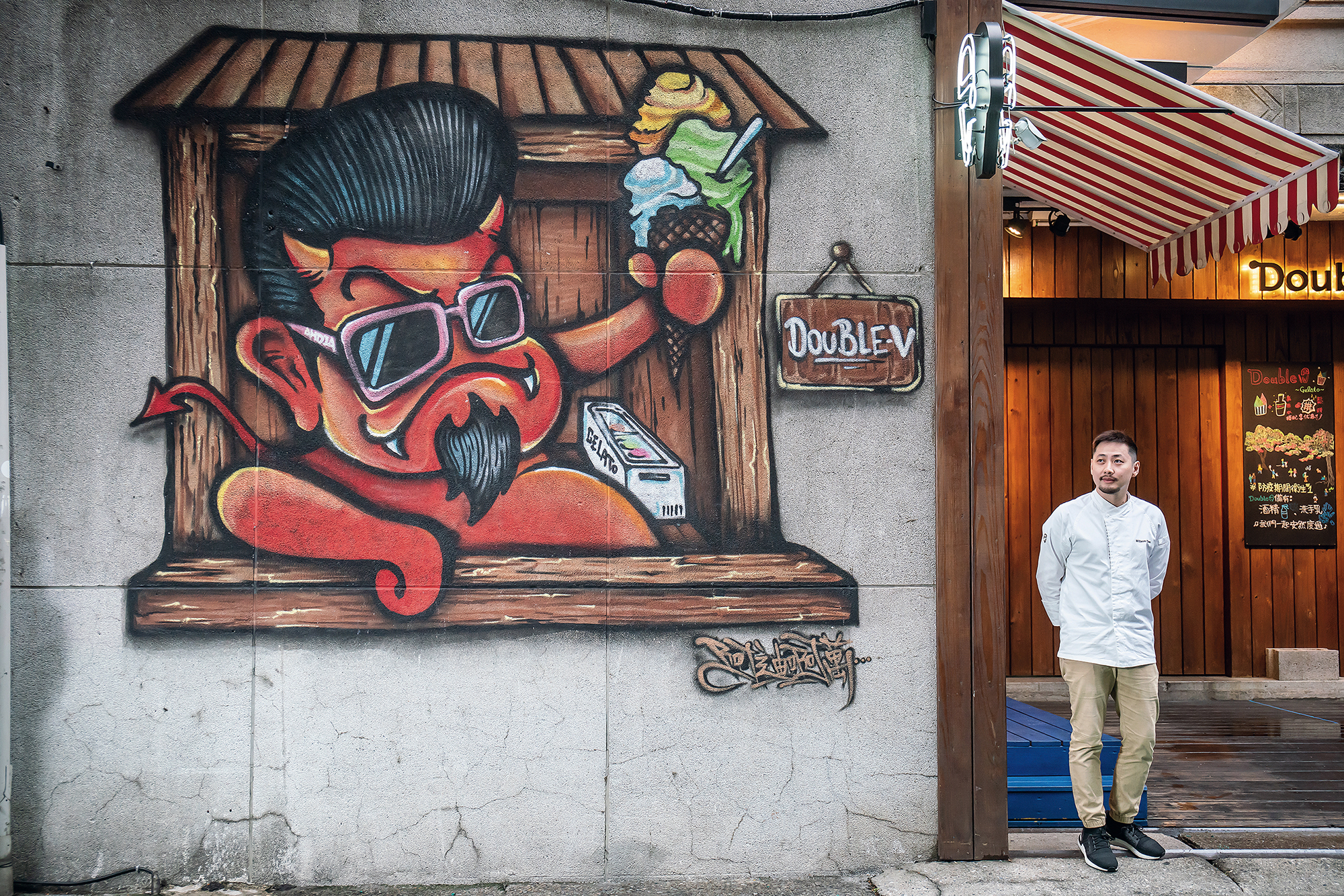 陳謙璿的第一間店,因開店時經費有限,一切從簡的他,以塗鴉代替傳統商家的霓虹招牌,卻因此創造出Double V的特色。