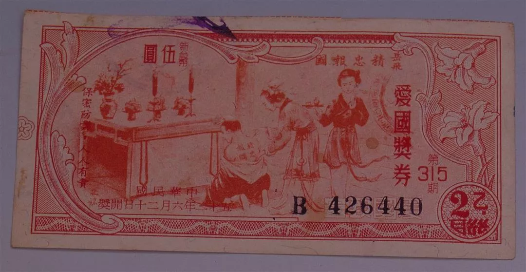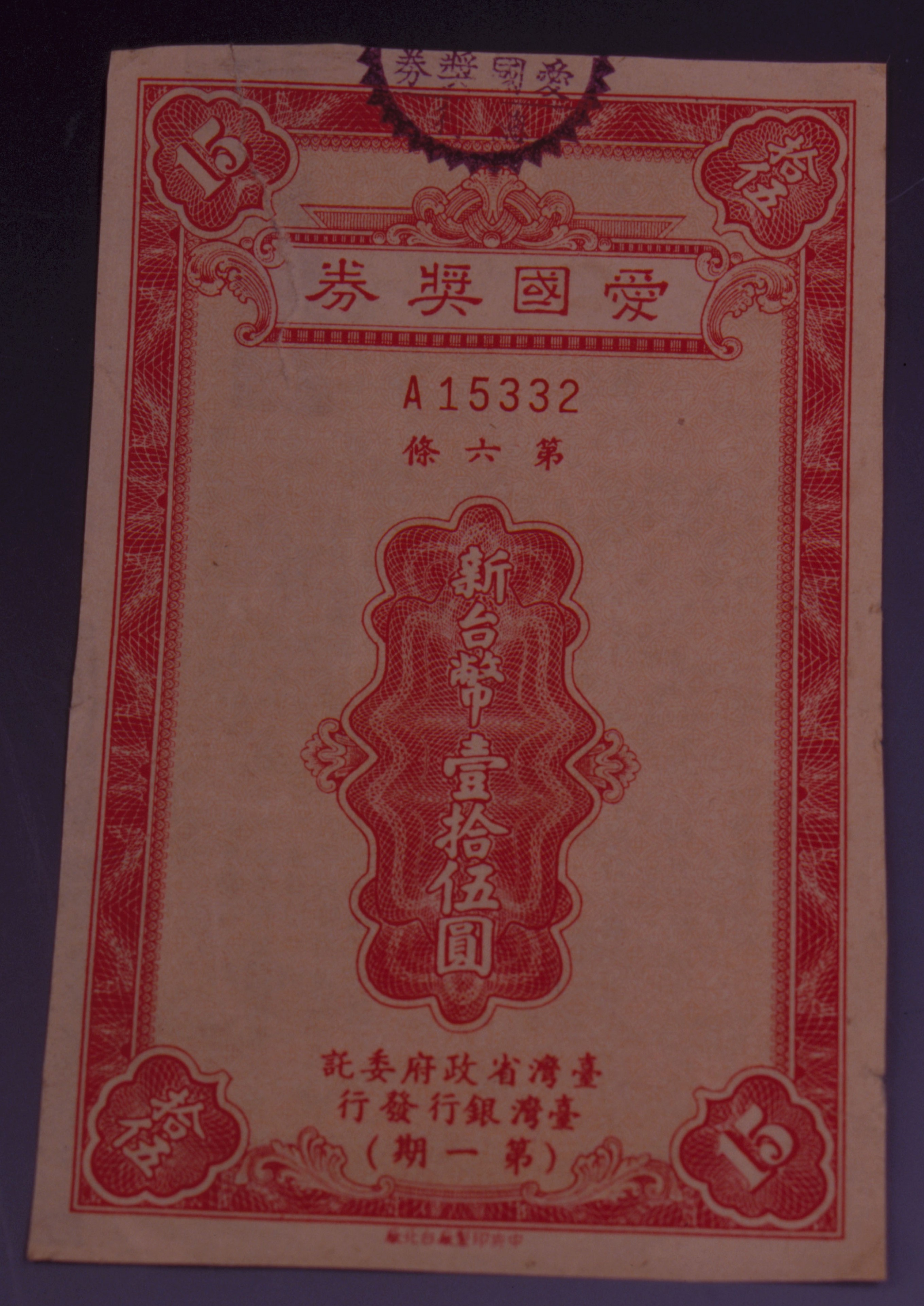圖2.:為第一期愛國獎券,直式單色仿鈔樣式。(郭娟秋/鐘永和)