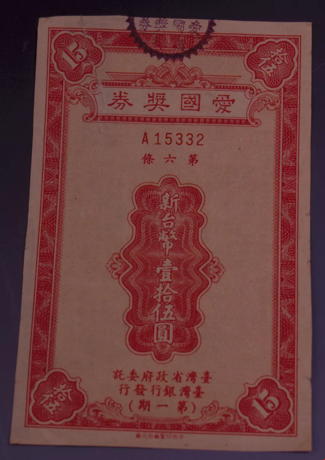 當年四月十一日,愛國獎券誕生,首次發行一萬張,每張十聯,共十萬聯。每聯售十五元,並於當月底在臺北市中山堂公開搖出一千一百六十八個獎,最高獎額廿萬元。可惜的是,以當時的經濟環境,十五元的售價嫌高,所以銷售情形不佳。