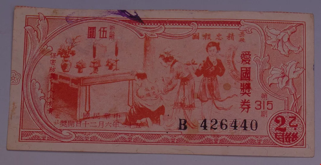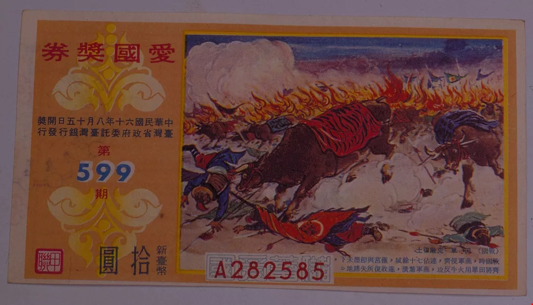圖3.:的三一五期愛國獎券,改以彩色印刷;圖4.:的五九九期,券面因梁又銘的繪畫,更添藝術氣息。(郭娟秋/鐘永和)