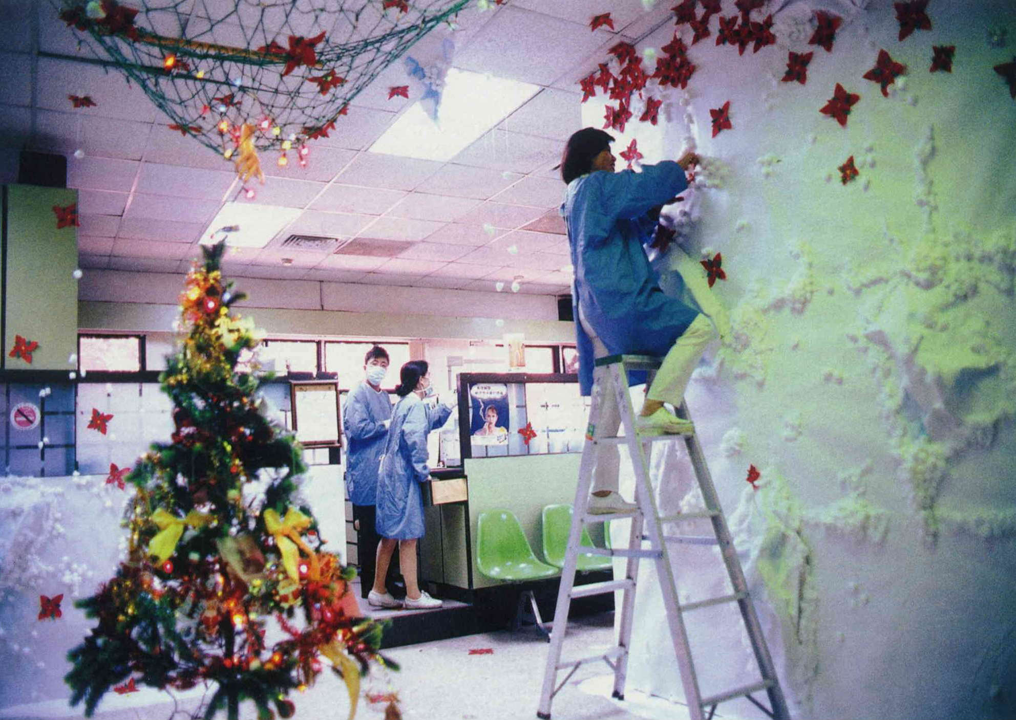 十二月初,來到門諾,剛落成啟用的新大樓大廳中央佈置著一棵高大的聖誕樹,掛號、看診、批價領藥,甚至是員工辦公室裡,無處不是彩帶、雪花、燈泡,五彩繽紛,整個醫院洋溢著一股濃厚的耶誕氣息,讓人絲毫嗅不到醫院的冰冷與悲苦,反而多了一些過節的溫馨氣氛。