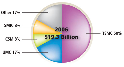 另一方面,IC設計公司的設計成本也已大幅增加,從0.13微米製程時的不到一千萬美元,到65奈米製程的4千5百萬美元以上,這會迫使許多大廠不再自行獨立設計,而與台積電等晶圓代工廠合作設計,這又是一個機會所在。