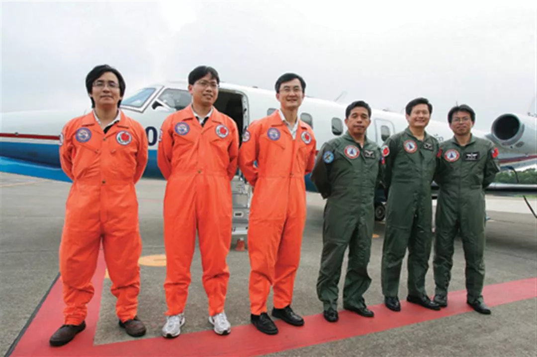 台大大氣系的「追風計劃」研究團隊,從2003年9月啟動至今,已針對24個接近台灣的颱風,完成28航次的飛機偵察,對各國氣象單位有極大助益。圖左三為主持人吳俊傑;下為漢翔航空的小型噴射機ASTRA。