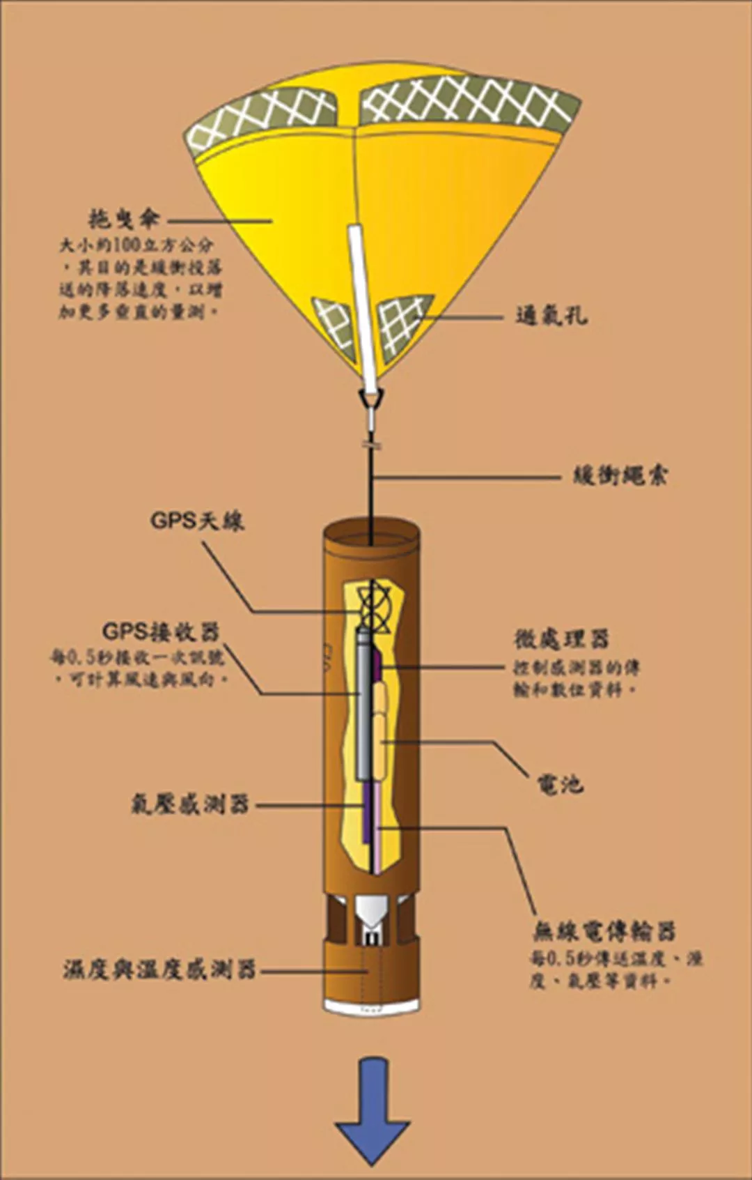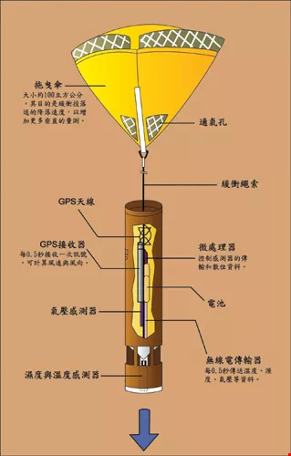 「投落送」剖面圖,內有溫度、溼度和氣壓感測器等。