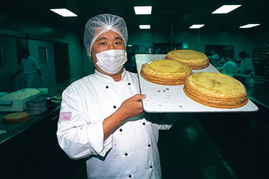 85度C堅持所有的蛋糕均為「半手工」製造,像西點事業部經理倪世豪手上這個「法式千層」蛋糕,就是一層蛋皮、一層奶油層層堆疊上去的,總計得堆18層。