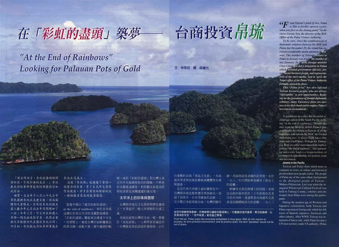 旅遊手冊以「就在彩虹的盡頭」(at the end of rainbows)來形容帛琉這個位於南太平洋的美麗群島國家。「彩虹的盡頭」聽起來彷彿遙不可及,但實際上,她是台灣目前距離最近的邦交國,直航只要三個半鐘頭的航程,或許「彩虹的盡頭」對台灣人而言另外有兩個更貼切的隱喻:不熟悉的美麗遙遠國度,和對觀光旅遊或經貿投資都是商機處處的處女地。