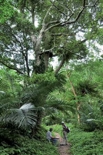 不時還可看到崖薑蕨與台灣山蘇花展現驚人的附生能力,隨處可見冰河時期的孑遺筆筒樹,伸展著擎天大型綠傘,莖條上密生的羽狀複葉,柔軟得像是隨著頑皮的風,輕輕舞動。