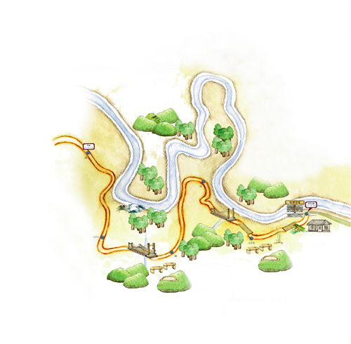 走入古道深處,細心體會每一個步伐,漫行於平緩且富有彈性的土石路徑;小水道上方,搭起整齊的樹木枝條;上坡處順著地形鋪設的石頭步道,特意調整成合適的步距,讓人走起來特別能配合身體的律動與呼吸。