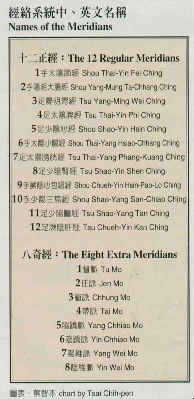 十二正經:The 12 Regular Meridians 1. 手太陰肺經 Shou Thai-Yin Fei Ching 2. 手陽明大腸經 Shou Yang-Mung Ta-Chhang Ching 3. 足陽明胃經 Tsu Yang-Ming Wei Ching 4. 足太陰脾經 Tsu Thai-Yin Phi Ching 5. 足少陰心經 Shou Shao-Yin Hsin Ching 6. 手太陽小腸經 Shou Thai-Yang Hsiao-Chhang Ching 7. 足太陽膀胱經 Tsu Thai-Yang Phang-Kuang Ching 8. 足少陰腎經 Tsu Shao-Yin Shen Ching 9. 手厥陰心包絡經 Shou Chueh-Yin Hsin-Pao-Lo Ching 10. 手少陽三焦經 Shou Shao-Yang San-Chiao Ching 11. 足少陽膽經 Tsu Shao-Yang Tan Ching 12. 足厥陰肝經 Tsu Chueh-Yin Kan Ching