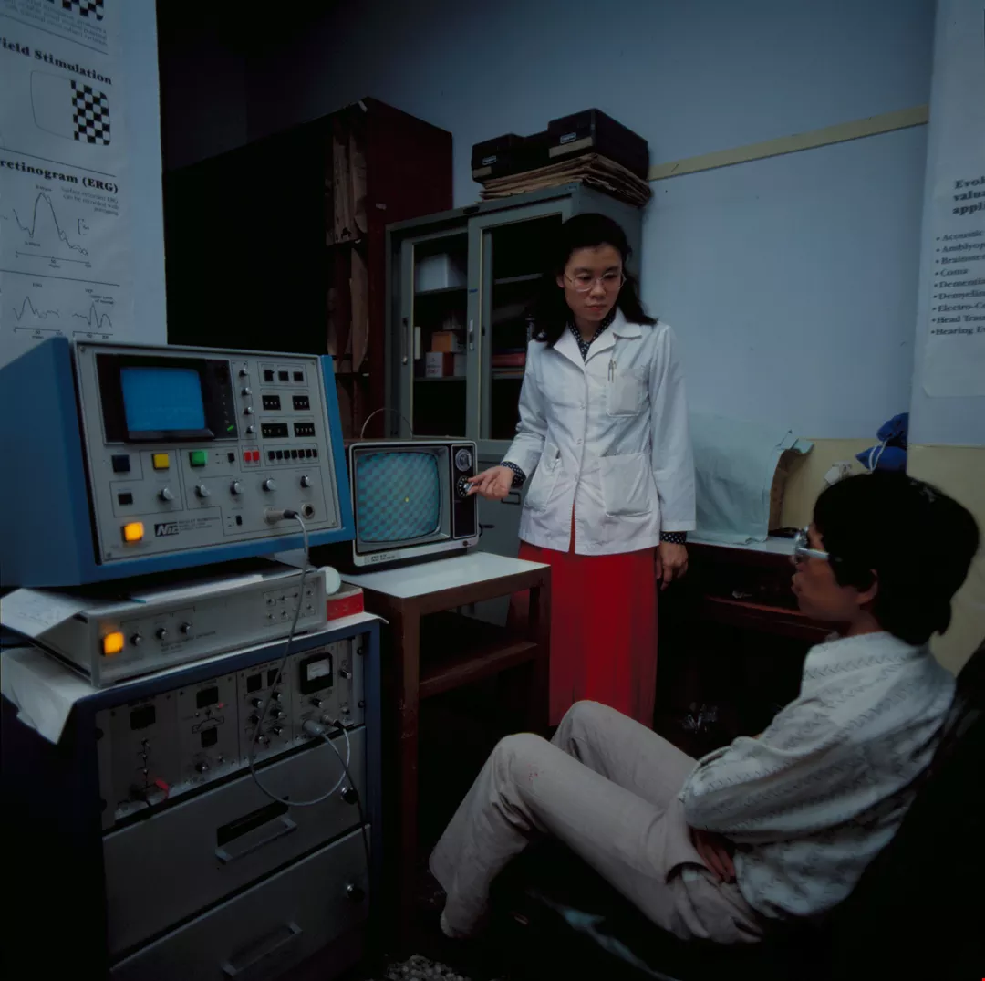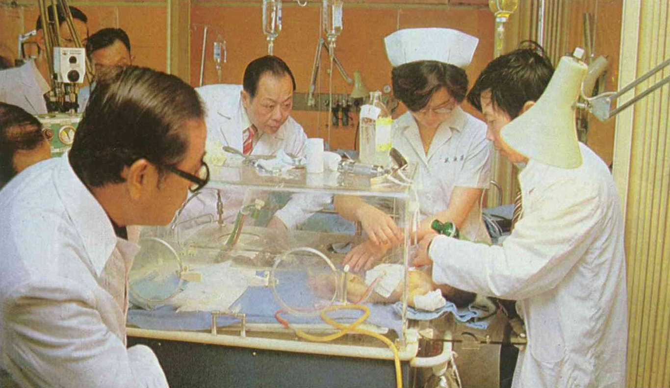 圖6:高醫的醫療水準高,設備齊全,故行政院衛生署委託它辦理醫師再訓練,讓國內各衛生所的醫師到此受訓。圖為受訓者正凝神觀看院內醫師處理早產兒加護情形。(楊永山)
