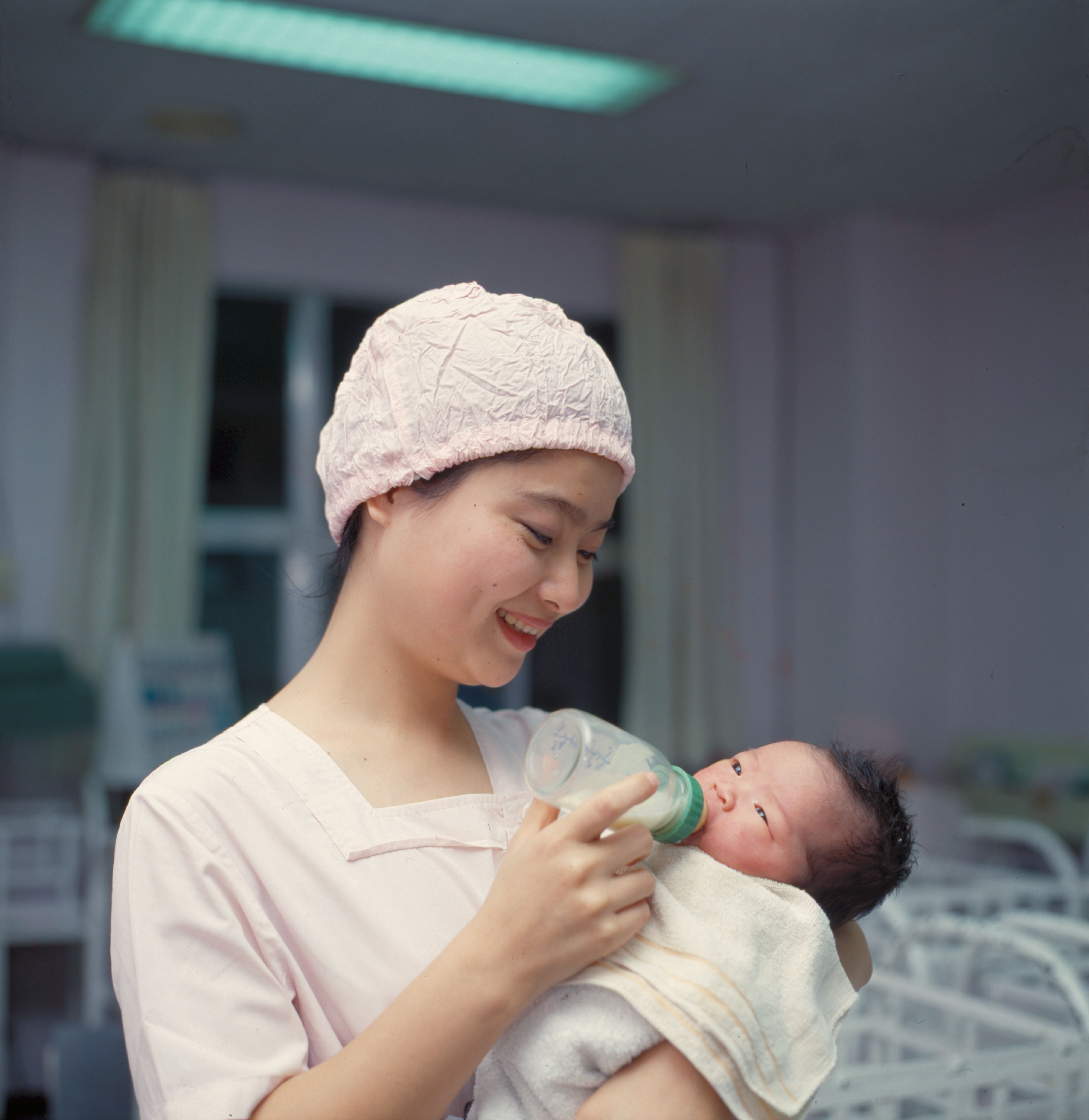 圖3:嬰兒室中有許多剛出生的小娃娃,是醫院裏最富生機的地方。圖為護士正在為新生兒餵奶。(楊永山)
