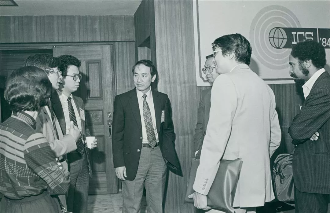 圖2.:旅美學人葉祖堯教授(中)日前回國參加一九八四年國際計算機會議,與中外學者暢談世界及我國軟體業發展的方向。(鐘永和)