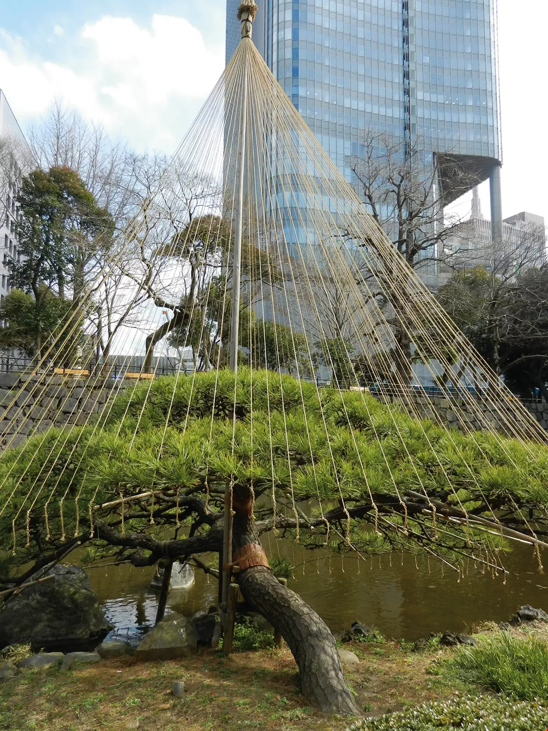 日本冬季為了避免樹幹因為雪的覆蓋而折損斷裂,先用繩子固定,進行雪吊保護措施,成為一種庭園造景特色。 (柿子文化事業公司提供)