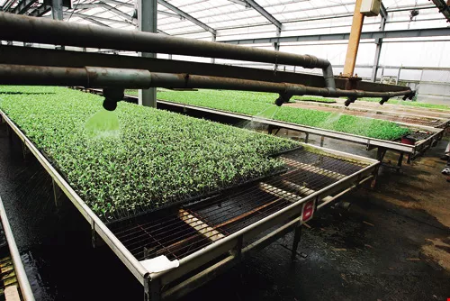 14年前他大手筆花費上千萬元,逐步將露天苗圃改建成簡易溫室和4.5米高的鋼骨溫室,裝設自動播種機,從穴盤排放、翻土、填土到播種,完全自動化。林應樹比較說,人工播種一天8小時只能播100盤,自動化後,效率提高到1,000盤;以前人工灑水要3小時,現在只要按下電動鈕就好了。